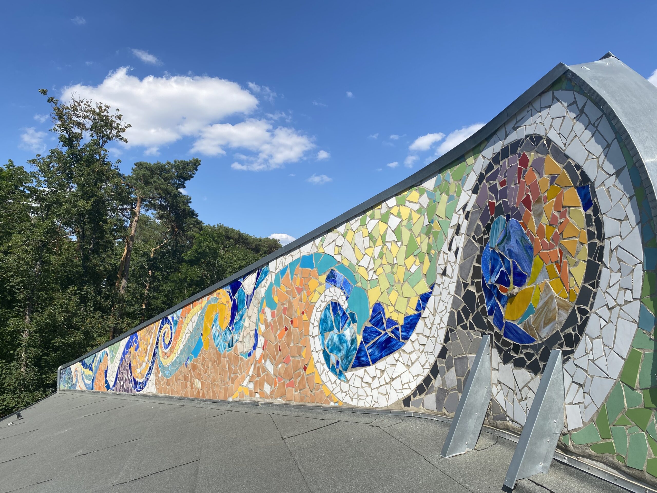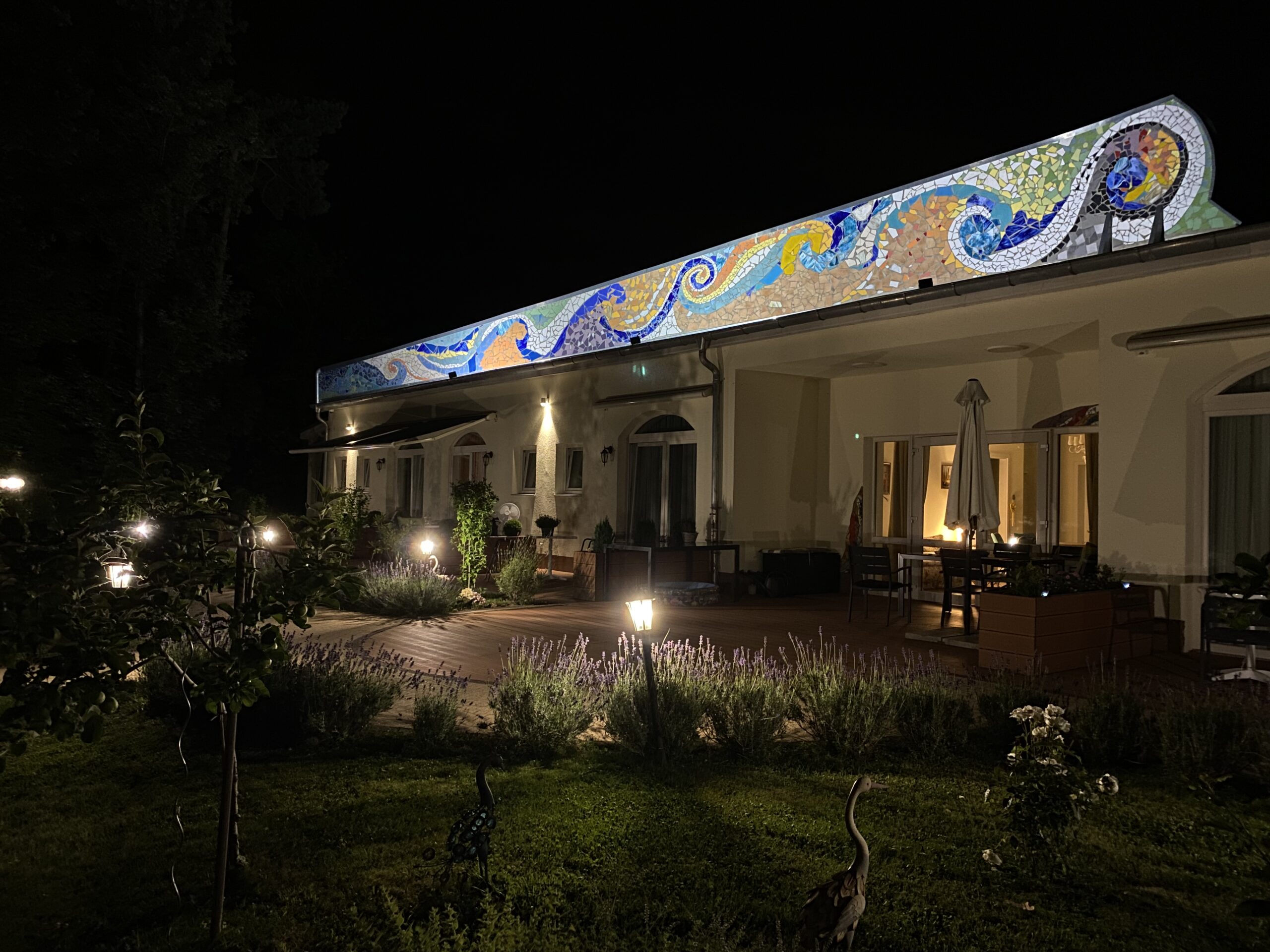 Auf der Gartenseite offenbart sich ein weiteres stilles Wunder. Dort beginnen sanfte Wellen aus Mosaikkunst – klein und zart, fast schüchtern – und wachsen mit jedem Schritt, bis sie sich zu einer kraftvollen, majestätischen Spirale entfalten. Diese Spirale erzählt vom Lauf unseres Lebens: von Höhen, die uns beflügeln, und Tiefen, die uns prüfen. Es gibt Zeiten, in denen wir glauben, es könne nicht schwerer werden – und doch fordert uns das Leben erneut heraus. Dann wiederum gibt es Augenblicke, in denen wir denken: Schöner kann es nicht werden – und dennoch öffnet sich eine neue Tür, ein neuer Abschnitt.