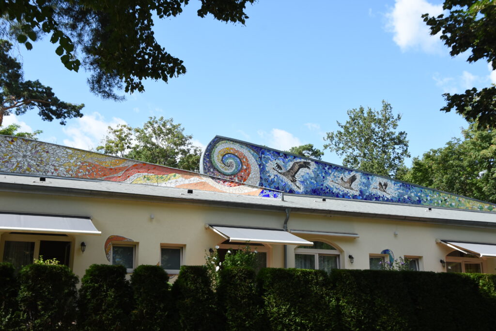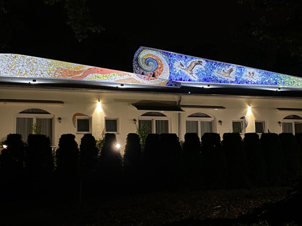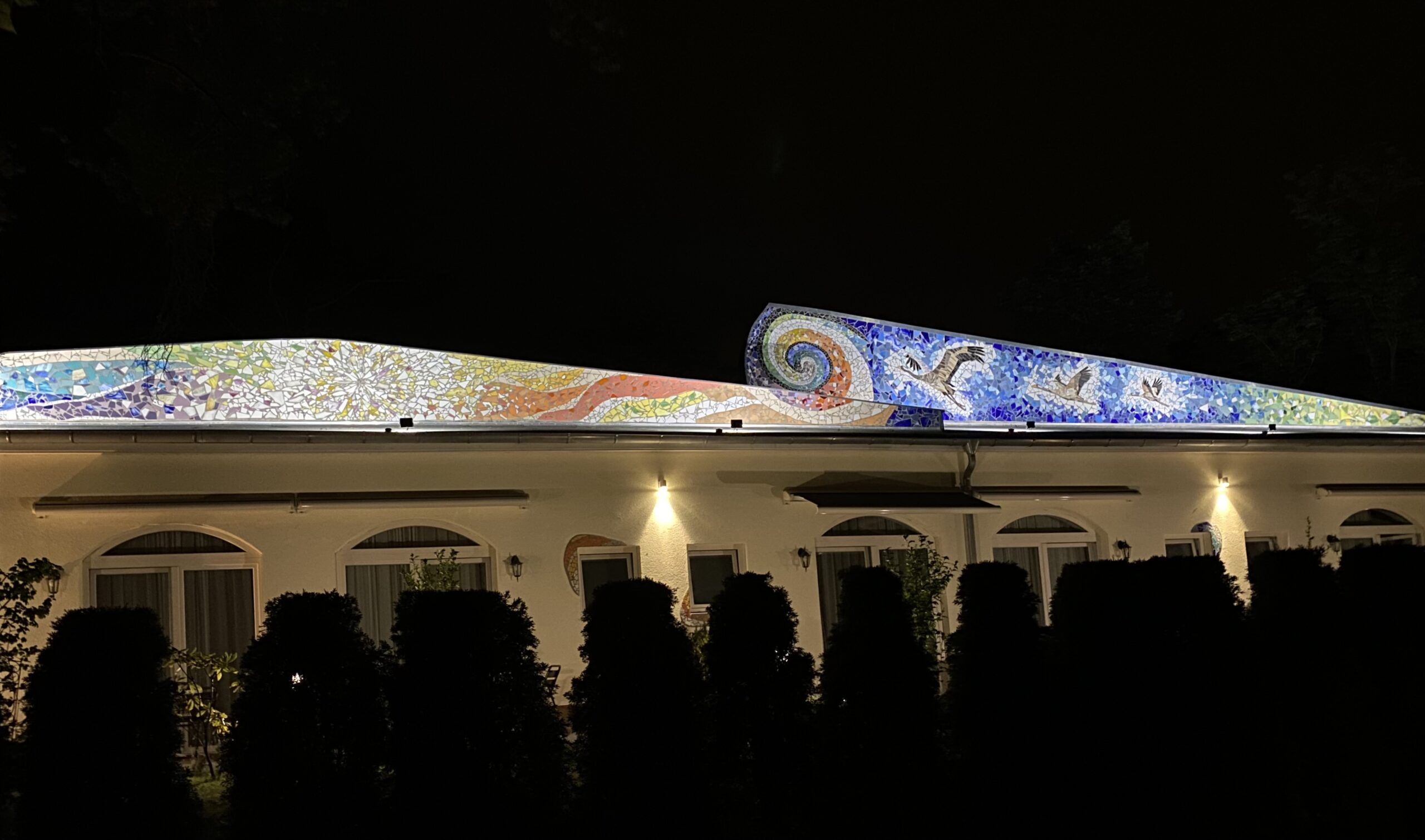 Die Außenfassade unseres Hospiz Ipek ist ein Kunstwerk, das Geschichten erzählt. Schon beim Betreten des Grundstücks werden Sie von einer Welt aus Mosaik verzaubert. Kraniche und Pfauen erheben sich in buntem Glanz, kunstvoll in Stein gefasst. Das Dach wurde so gestaltet, dass die Kraniche in eine Spirale hineinfliegen – ein Tanz aus Form und Bewegung. Danach folgt ein Abschnitt in warmen Farben, wie ein Sonnenaufgang, der Geborgenheit schenkt. Schließlich sehen Sie die Kraniche an der Fassade wieder hinabgleiten – als würden sie eine Reise beginnen und beenden zugleich.