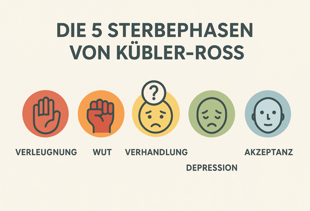 Die Sterbeforscherin Kübler-Ross hat nach vielen Forschungen den Tod in fünf Phasen des Sterbens eingestuft.